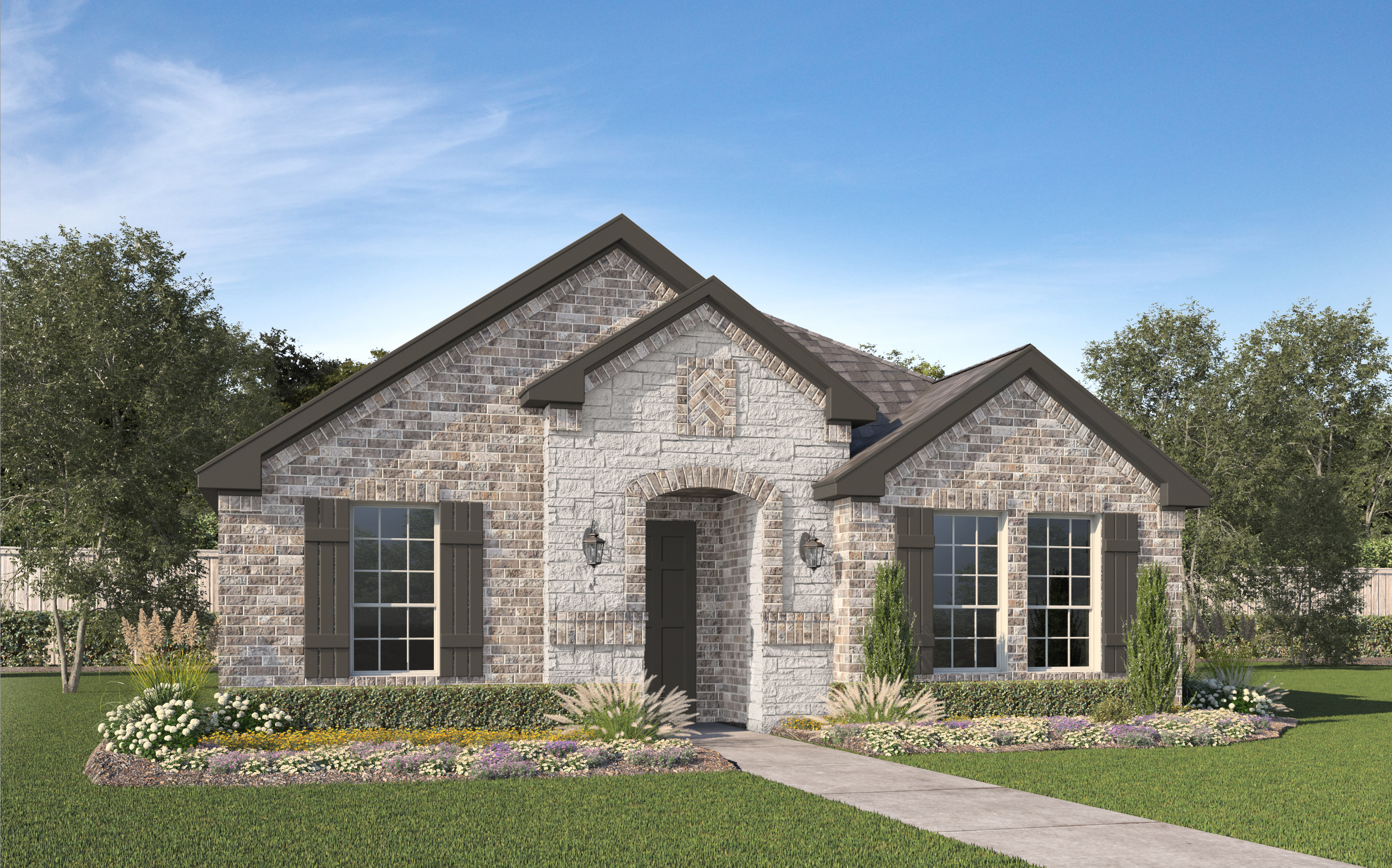 Our Flora plan is a one-story, 1,874 square foot home featuring three bedrooms, two bathrooms, a flex room, and a two-car garage. This home is available with A and B elevations.