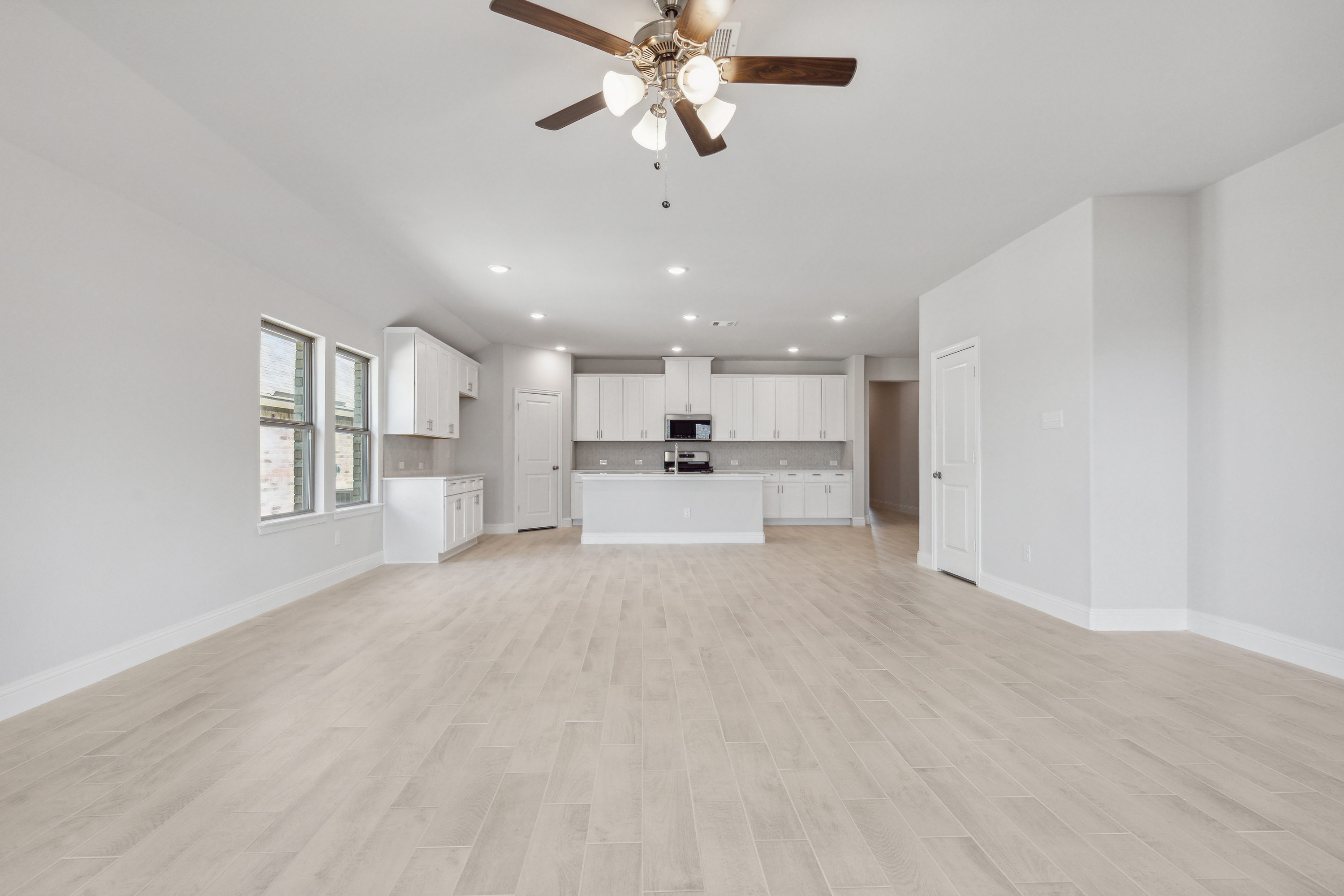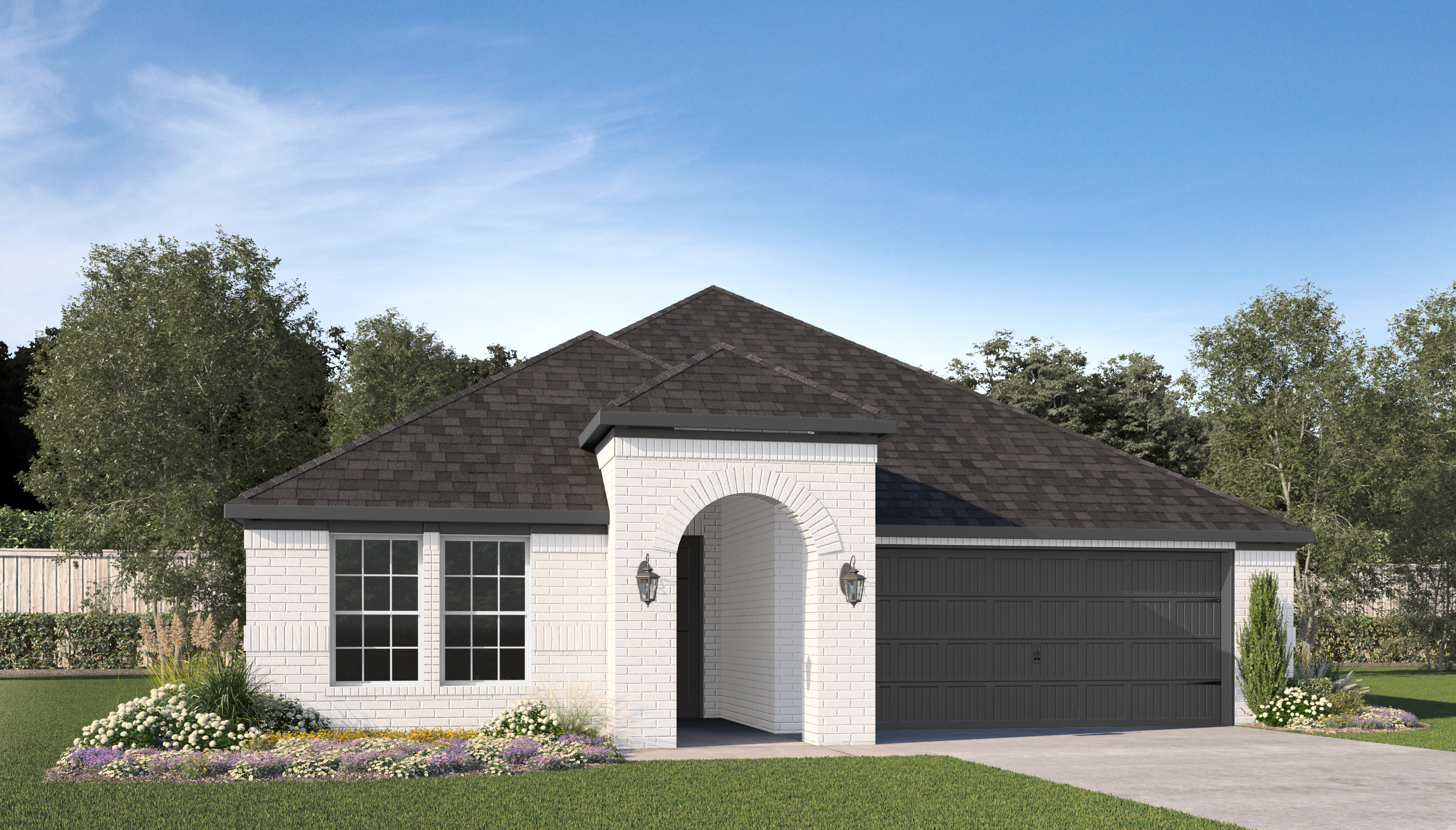 Our Lily plan is a one-story, 2,156 square foot home featuring three bedrooms, two bathrooms, a flex room, and a two-car garage. This home is available with A, B, and C elevations.